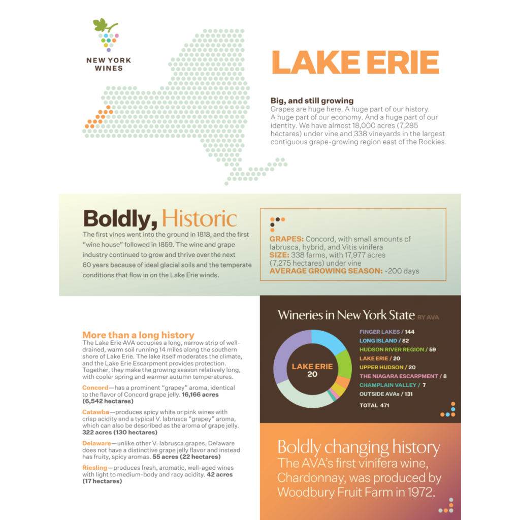 A sheet containing facts, figures, and fascinating information about the Lake Erie AVA’s grapes, wines, climate, terroir, and more.
